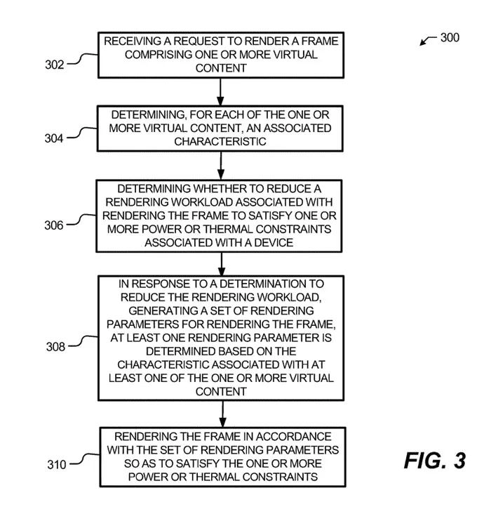 对于XR设备,渲染是耗能大户,所以管理渲染负载是一个重要课题。在名为“Rendering workload management for extended reality”的专利申请中,Meta就提出了用于XR的渲染负载管理,在设备向用户渲染和显示帧时减少处理能力、功耗和热影响的各种渲染负载管理技术。