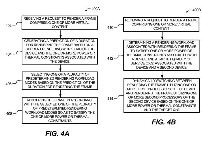 图4A示出了用于提供渲染工作负载管理技术的流程图,主要用于生成用于渲染帧的持续时间的预测,从而降低设备的处理能力、功耗和热影响。