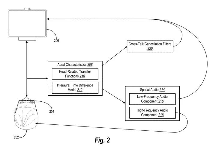 如图2所示,空间音频扩展系统106利用听觉特征208来产生串音消除滤波器220。具体地,空间音频扩展系统106为空间音频214的低频音频component216生成串扰抵消滤波器。