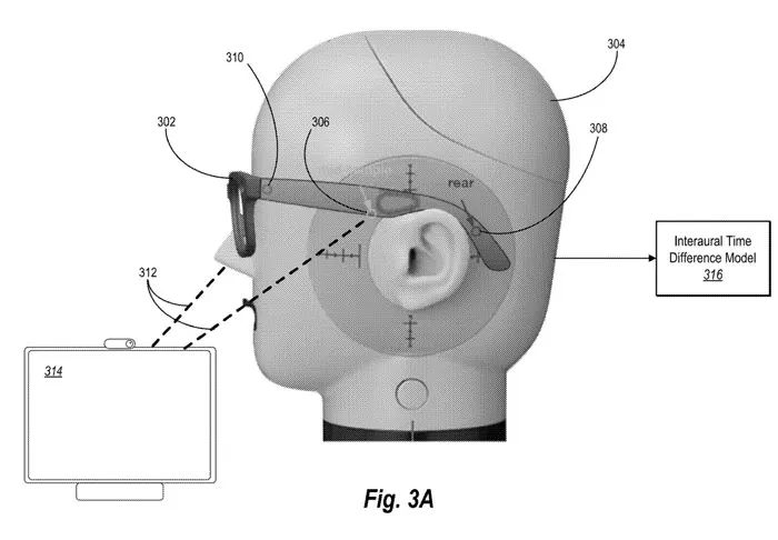 图3A示出根据一个或多个实施例确定用于用户304的耳间时差模型。可穿戴音频设备302包括位于用户304的太阳穴中部区域附近的麦克风306。所述可穿戴音频设备302同时包括位于后部的麦克风308。另外,可穿戴音频设备302包括位于靠近前面的麦克风310。
