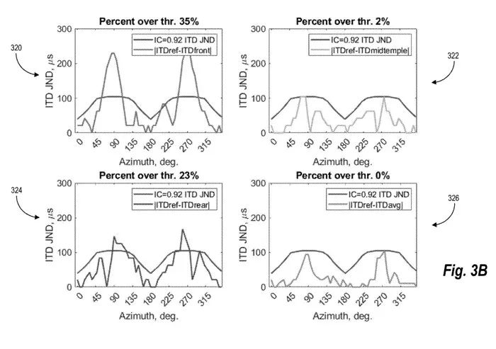 如图3B所示,空间音频扩展系统106可以使用可穿戴音频设备的各种麦克风确定用户耳间时差的感知有效模型。例如,对于大多数方位角,图326中绘制的绝对差值远远低于绘制的JTD线。因此,图326表明,中左右对麦克风和后左右对麦克风的组合近似于用户的真实耳间时差。