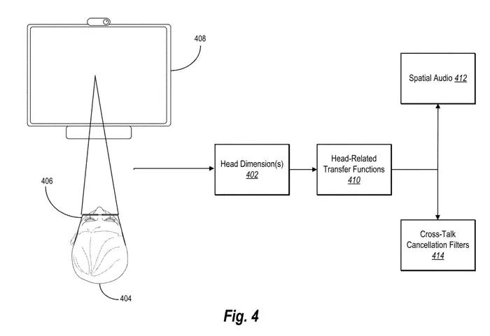 空间音频扩展系统106利用头部尺寸402来确定可穿戴音频设备406的用户404的与头相关传递函数410,并利用头相关传递函数410来生成空间音频412以呈现给用户404。