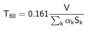 其中,V表示房间体积(单位为 m3 , Sk 表示房间内第k个吸声材料的表面积 (单位为m²), αk 表示房间内第k个吸声材料的吸收系数。