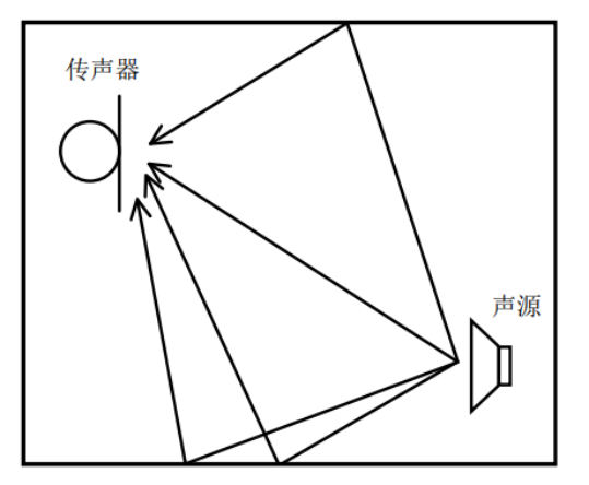 在封闭的空间中,当声源产生的声音经过反射物(墙壁、地面和室内装饰物等)多次反射叠加后会形成混响,如图1所示。在均匀介质声场中,声源到传声器的直达声传播时间最短,人们将在直达声之后 50-100 ms内被传声器接收到的反射声定义为早期混响,在直达声50-100 ms之后被传声器接收到的反射声定义为晚期混响。早期反射声虽然会降低传声器拾取的语音信号质量,但是可以提高语音信号的可懂度[1,2],而晚期混响会模糊和混淆语音信号中的音节,降低语音信号的质量和可懂度。通常采用混响时间(Reverberation Time,T 60)用于衡量房间混响程度。T60指是对放置房间中的宽带声源进行激励并关闭声源,待信号能量衰减 60 dB 时所需的时间,可以由赛宾公式计算得到: