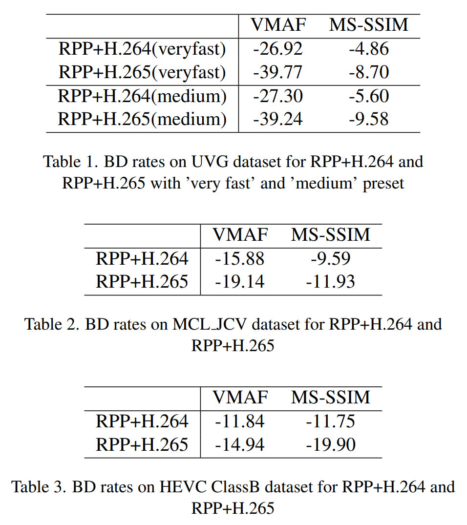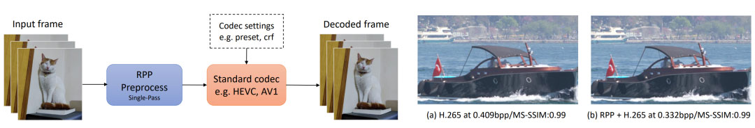 上图中左侧为本文前处理器的工作流程:对输入帧进行单帧处理,适用于所有标准视频编解码器。右图:H.265与RPP + H.265的在相同的MS-SSIM下的码率差异。