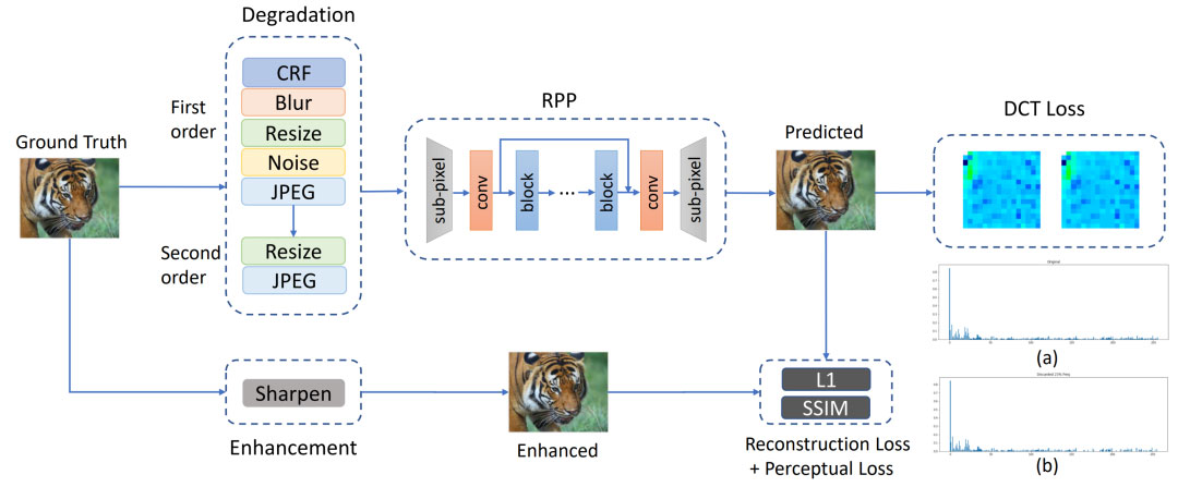 我们的前处理模型的目标是通过可学习的前处理神经网络提供一个同时在码率和感知方面进行优化的输入帧。具体而言,为了在码率和失真之间实现模型的优化平衡,我们设计了一种自适应的DCT损失,可以减少空间冗余并保留感知中的关键高频成分。另一方面,对于感知优化部分,我们旨在通过使用MultiScale-SSIM来感知地增强我们的前处理输入帧。我们将其用作训练过程中的损失函数。此外,我们还结合了高阶退化建模过程来模拟真实世界的复杂退化。通过使用这种高阶退化方法生成训练数据对,我们的前处理网络可以训练来处理真实世界中的一些复杂退化,从而提高网络输出的感知质量。此外,为了性能和效率,我们构建了一个轻量级的全卷积神经网络,其中包含通道注意力机制。在部署框架中,对于给定的视频帧fi,它只需通过RPP网络进行一次前向传递。然后,RPP网络的处理帧 f0 可以由标准视频编解码器(如AVC、HEVC、VVC或AV1编码器)进行编码。