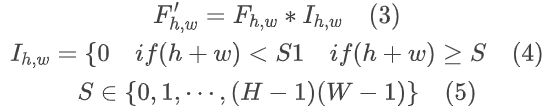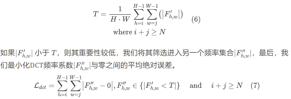 在图像中,大部分能量将集中在较低的频率上,因此在传统的压缩算法中,它们简单地丢弃了较高频率的系数以减少空间冗余。然而,一些高频分量在整个帧的视觉质量中也起着非常重要的作用。我们引入了自适应DCT损失用于视频预处理。我们使用DCT将帧转换到频域后,我们通过使用ZigZag顺序遍历选择属于高频分量的频率系数I。公式可以写为: