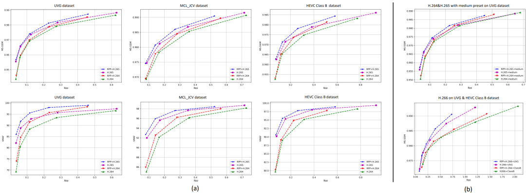上图和以下三个表的结果显示,我们提出的方法可以明显提升三个数据集上标准编解码器的VMAF和MS-SSIM两个指标的BD-rate。在VMAF下,RPP + H.264平均节省18.21%的码率。在MS-SSIM下节省8.73%的码率。在VMAF下,RPP + H.265平均节省24.62%的码率,在MS-SSIM下节省13.51%的码率。一些基于学习的视频编码器只有在“very fast”预设下才能超越传统标准编解码器。为了证明我们方法的通用性,我们还使用“medium”预设测试了我们的RPP方法。如图中(b)的顶部图所示,我们的方法仍然优于标准编解码器,这与(a)中的“very fast”预设结果一致。此外,我们还在UVG数据集和HEVC B类数据集上使用H.266测试了我们的RPP方法。如图中(b)的底部图所示,在这两个数据集上,RPP + H.266的平均码率节省率在MS-SSIM下为8.42%。正如我们预期的那样,当与所有主流标准编解码器联合使用时,我们的方法都可以获得显著的提升。