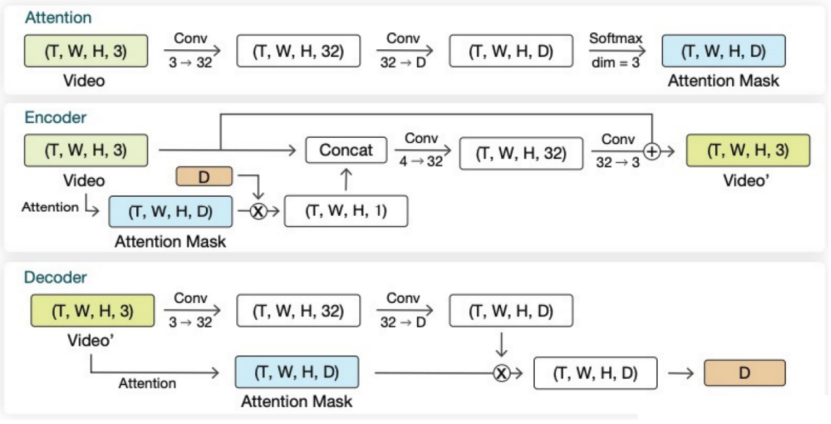例如RivaGAN,其框架如图7所示。Attention模块根据原始图像推导出目标数据的分布Attention Mask,Encoder模块再利用这个数据将水印数据D嵌入视频中。RivaGan在训练过程中分别使用了一个Critic网络评估画面失真和一个Adversary网络模拟主动攻击,并且增加了人工设计的Noise网络模拟常见的传输失真(包括缩放、裁剪、有损压缩),以期同时在画面失真和鲁棒性方面得到较好的结果。