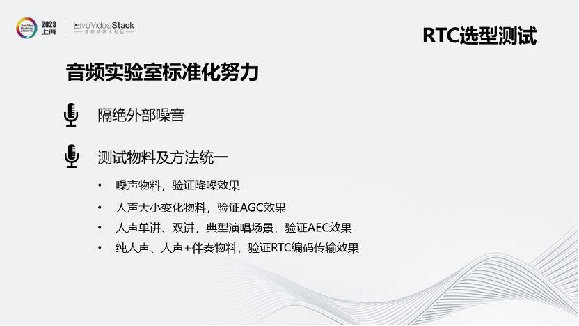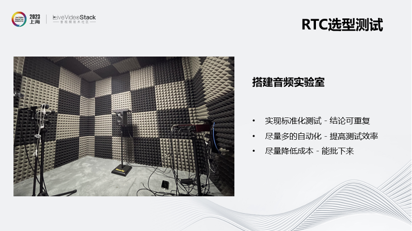 我们在音视频实验室标准化方面也做了一些努力。首先是隔绝外部噪音;另外统一测试物料及方法。