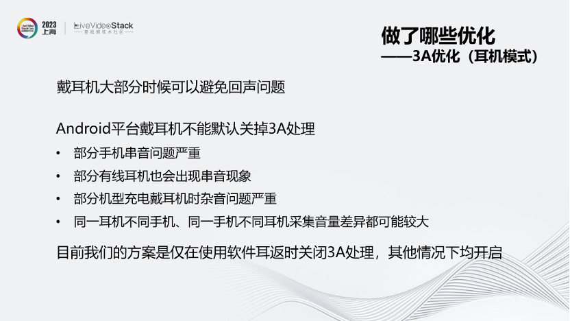 接下来是耳机模式下的3A优化。戴耳机场景下大部分时候可以避免回声问题,但Android平台戴耳机不能默认关掉3A处理,导致一些串音和杂音等问题。