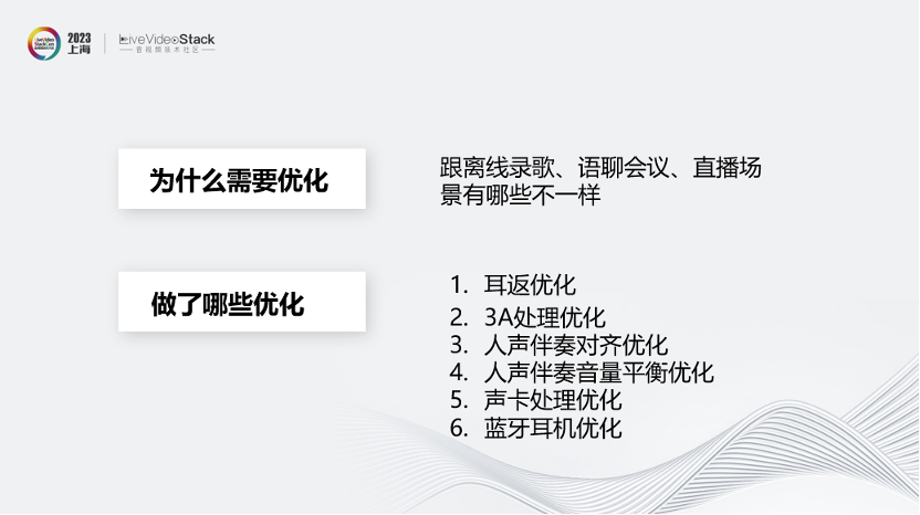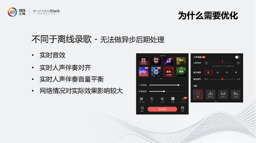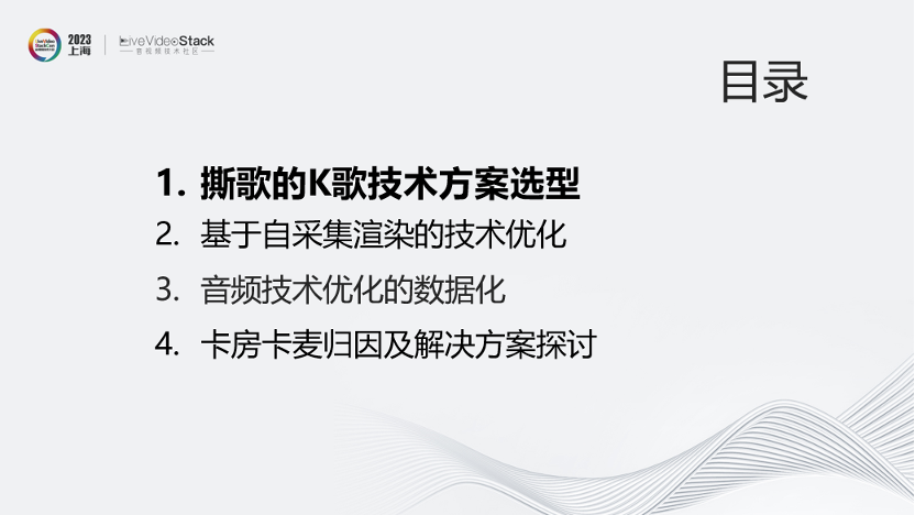 大家好,今天我主要介绍撕歌在在线K歌方向上的技术优化点。我看到之前LiveVideoStackCon上是有做过关于K歌多维度打分方面的内容,而我今天分享的重点则是在工程优化方向。