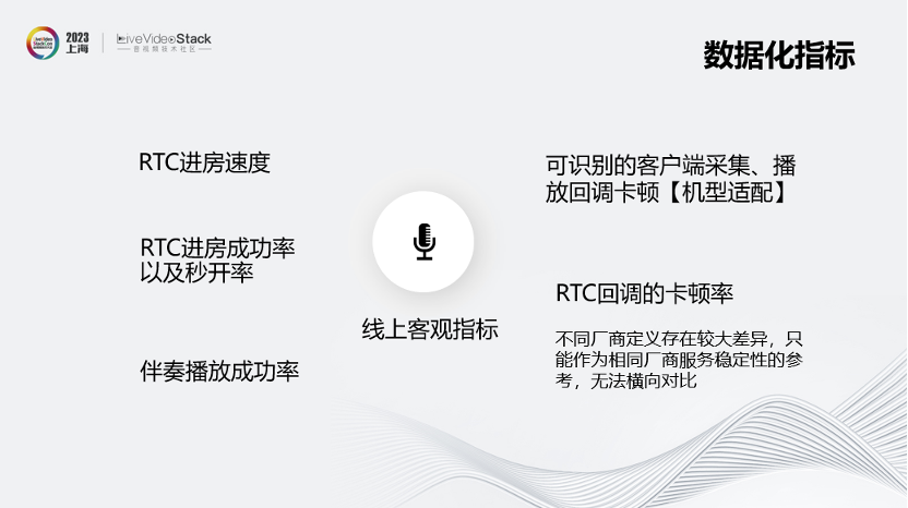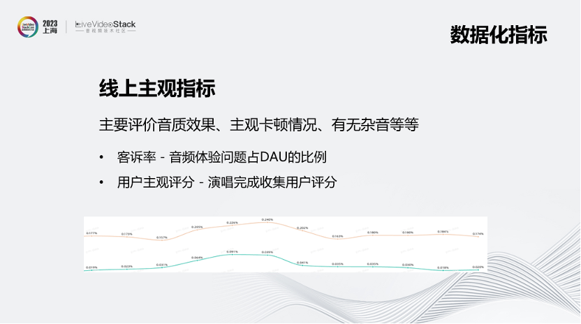 目前我们设立了两个指标,通过客诉率发现音频体验问题占DAU的比例,以及演唱完成后收集用户主观评分。