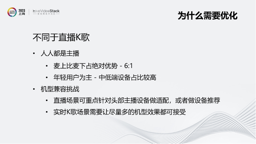 另外就是机型兼容挑战,直播场景可以针对主播设备做适配和推荐,但实时K歌场景需要尽量兼容更多的机型和效果。