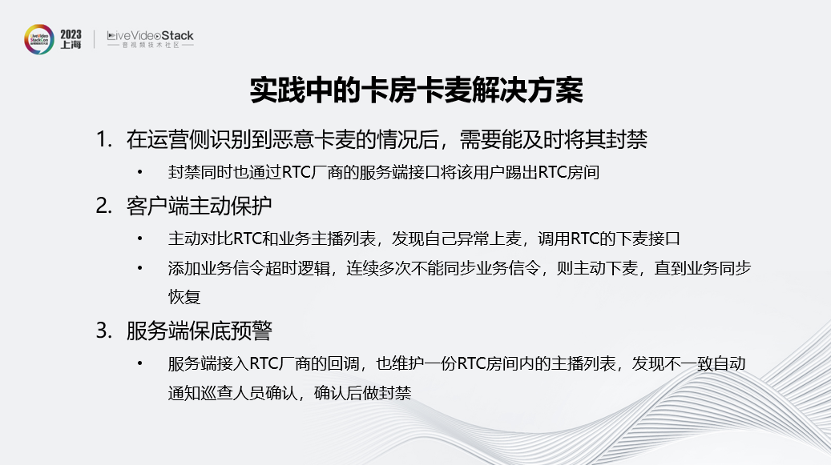 第三,服务端保底预警。服务端接入RTC厂商的回调,也维护一份RTC房间内的主播列表,发现不一致自动通知巡查人员确认,确认后做封禁。