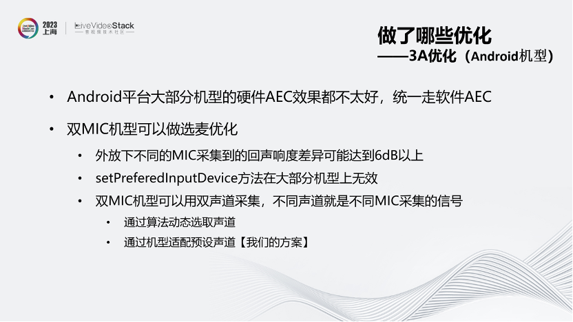 另外,双MIC的Android机型可以通过选取不同的MIC来降低回采回声的能量,让AEC算法更好处理。
