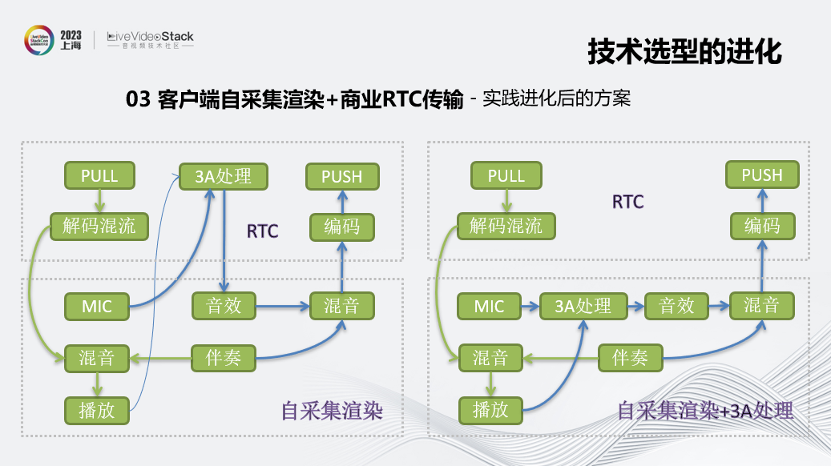 左图是用RTC厂商的3A处理。下框中的部分是我们自采集渲染部分做的事情,上框中的部分则是RTC厂商做的。