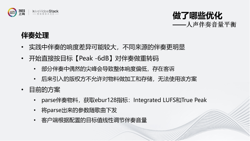 起初我们按照目标【Peak-6dB】对伴奏做重转码,但会导致一些问题,例如部分伴奏中偶然的尖峰会导致整体响度偏低,另外后来引入的版权方不允许对物料做加工和存储,导致无法使用该方案。