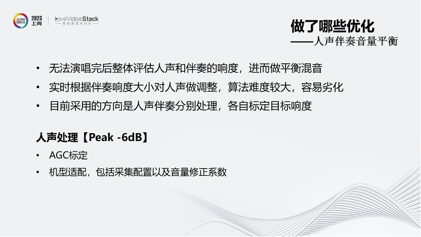 首先是人声处理,把最大Peak 值限制在6dB,这里面包含两方面:AGC标定,以及机型适配,包括采集配置以及音量修正系数。