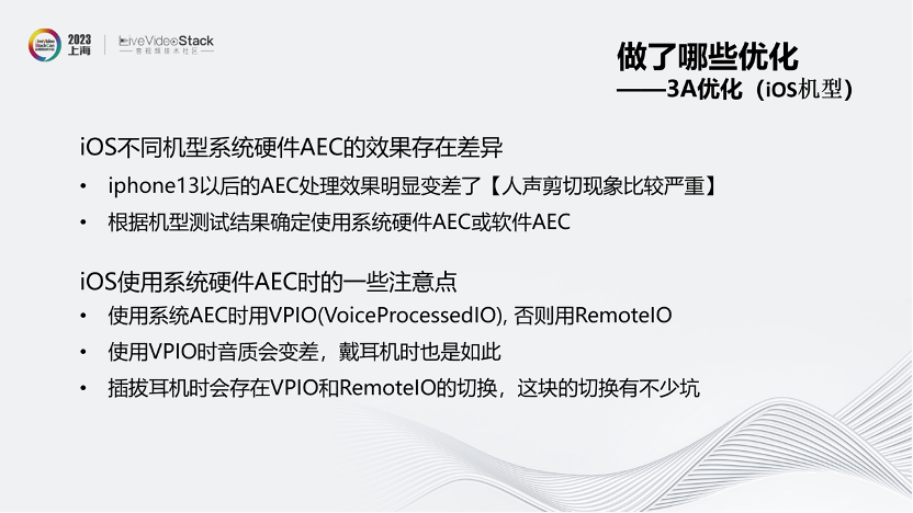 另外,iOS机型使用VPIO时音质会变差,不只是采集的音质,播放出来的声音也会跟RemoteIO下有比较明显的差异,应该是苹果为了AEC好做故意为之。有这个劣化点在,每个机型是要用硬件AEC还是软件AEC就需要做一个效果的综合评估。