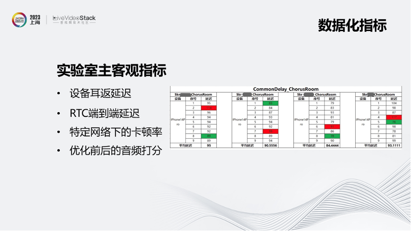 首先是建立的实验室主客观指标,例如设备耳返延迟、RTC端到端延迟、特定网络下的卡顿率以及优化前后的音频打分。
