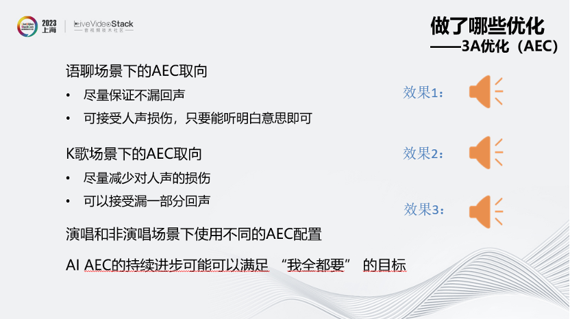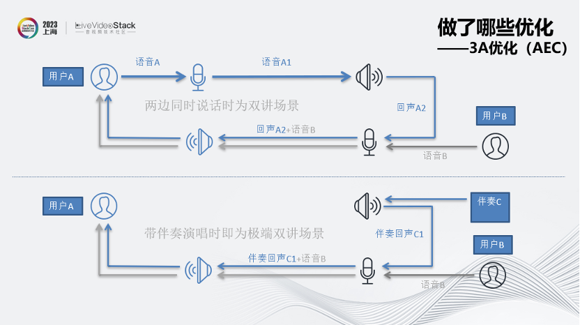 其次是3A优化(AEC)。图中上侧所示是AEC场景中回声产生的原因,下侧是K歌时的AEC场景,其默认就是极端双讲场景。