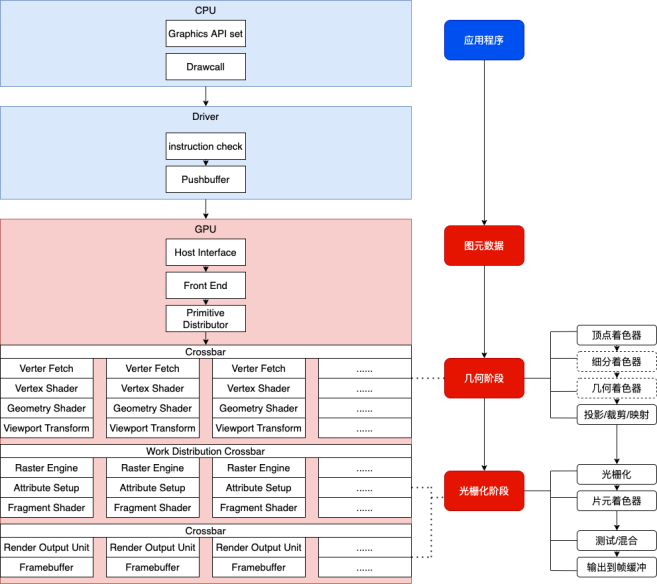 上图是简化的逻辑管线执行过程,可分为CPU和GPU阶段。在CPU部分,开发者利用图形API构建应用程序,通过drawcall发出指令,这些指令会被推送给驱动,驱动程序首先会进行指令合法性检测,然后将其存储到Push Buffer中。