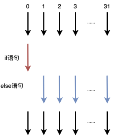 着色器代码指令是按照lock-step方式执行的,假设着色器代码中存在if-else语句,在一个Wrap中有32个线程,其中只有1个线程条件为真执行if语句,剩下31个线程均执行else语句,在执行if语句时,剩下31个线程会等待,当31个线程执行else语句时,执行if的线程会等待,即相当于每个线程if与else语句均执行了一次,整体执行流程如下图所示。在实践中,可以利用着色器提供的step函数来规避分支语句的编写。