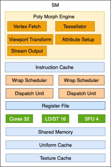 GPC中主要包含一个光栅化引擎(Raster Engine)和多个流式多处理器(Streaming Multiprocess, 即SM)。Raster Engine主要负责将图元数据转换为屏幕上的像素,SM主要用于执行开发人员编写的着色器代码,内部包含多个数学运算核心。SM的抽象结构如下图所示。