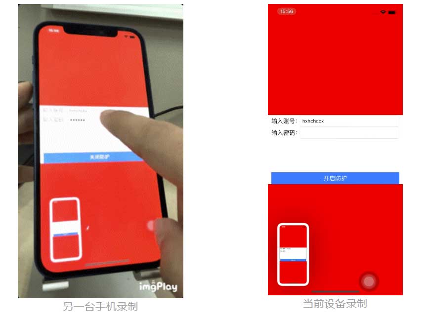 在上面视频中红色背景为 textCanvasView,上面添加了需要防护的视图,输入密码后面的 textfield已开启 secureTextEntry。可以看到,未开启防护时,截屏和录屏的时候,输入密码的 textfield 内容为空白;开启防护后,textCanvasView及需要防护的视图均已变为空白。