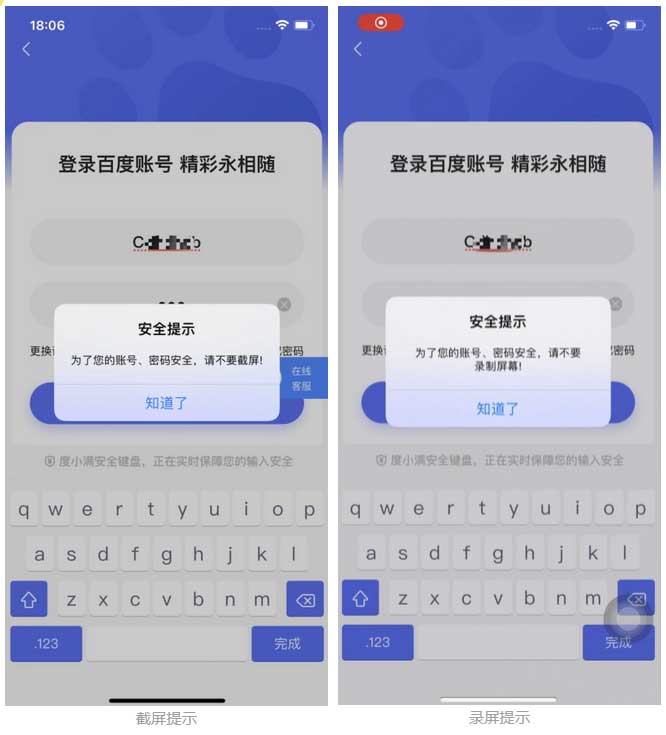 在 百度账号 SDK 中,因为通过textfield特性来实现放截屏录屏并不是苹果系统公开的正式 API,从稳定性角度考虑,当前仅是监听了截屏和录屏的通知,通过增加弹窗,提示录屏或截屏风险。