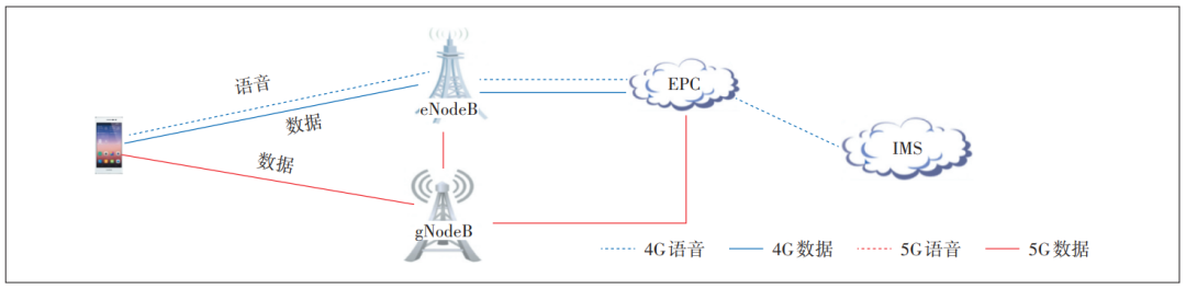 在NSA组网下,采用双连接方式,将5G NR控制面锚定于4G LTE,并利旧4G核心网EPC[7],网络架构如图1所示,语音服务依然由VoLTE提供,并可以通过SRVCC实现VoLTE和2G/3G CS网络之间语音呼叫的无缝切换。