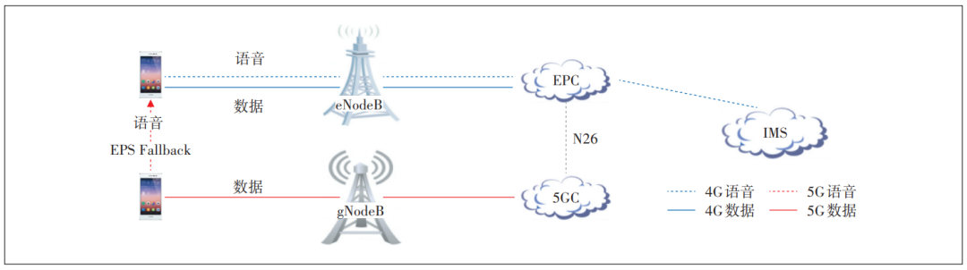 在5G SA部署初期,5G网络未能形成连续覆盖的情况下,需要引入EPS Fallback方案,以保障语音业务的连续性[8]。EPS Fallback在语音业务起呼阶段将用户重定向至4G网络,利用4G VoLTE网络承载语音业务,业务完成后再通过Fast Return功能使用户快速返回5G网络,网络架构如图2所示。
