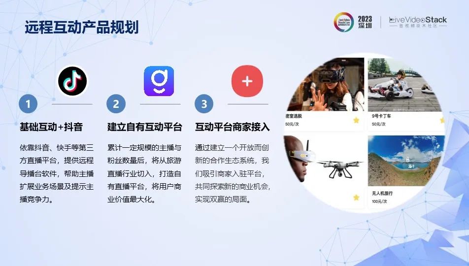 接下来介绍一个具体的远程互动应用案例。抖音认识到本地生活服务和旅游行业的商业前景,推出了营销旅游线路和景点门票的主题直播间,虽然成交量不低但仍存在几点瓶颈。