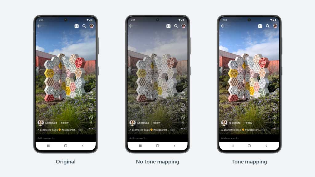 其中一个例子是 “探索 “选项卡,它将照片和视频混合显示在一个网格中。如果我们只是在此设置中启用 HDR,HDR 视频就会吸引额外的注意力,导致体验不平衡。在这种情况下,我们将使用与创建视频时相同的客户端色调映射,对视频进行即时色调映射。