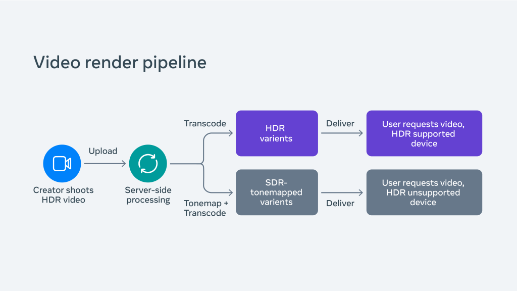 通过服务器端色调映射,我们可以将内容上传到我们的服务器,并保留原始 HDR 色彩信息,同时生成 HDR 和 SDR 表示,以便传输。 同时进行 HDR 和 SDR 编码使我们对 HDR 视频的计算量增加了一倍。利用我们的 Meta 可扩展视频处理器进行 HDR 处理,我们能够在不增加能源需求的情况下处理这种负载。