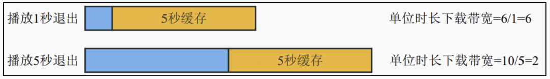 举个例子,用户观看同一个视频,缓存大小一直为5秒,比较1秒退出和5秒退出两种情况,前者的单位时长下载带宽是后者的3倍。
