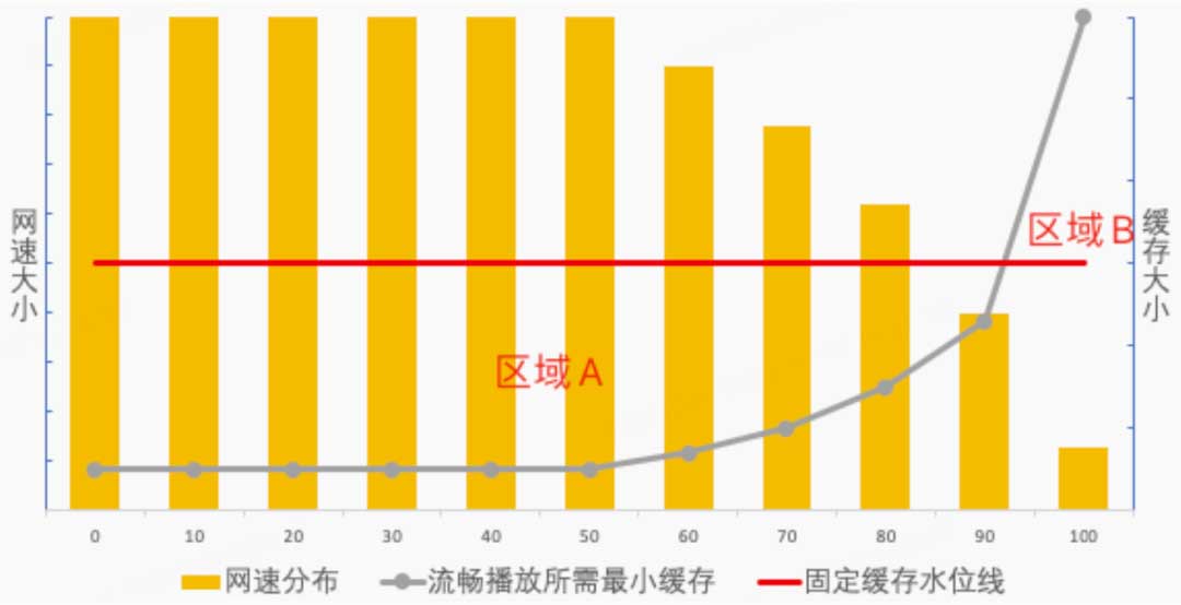 因此,简单且固定的缓存策略已经无法满足成本与体验的双重要求了。幸运的是,我们知道一定存在那条“流畅播放所需最小缓存”线,那么就让我们用技术手段求索这条线,既减少区域A的浪费、又减少区域B的卡顿。