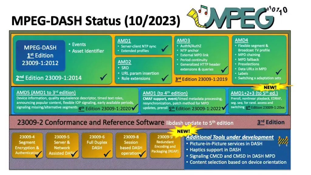 特别是,MPEG-DASH 第 6 版计划于 2024 年推出,但可能不包括所有正在开发的修正案。关于现有修正案的概述,请参阅上次会议的博文。目前的修正案已经(略有)更新,并将在即将召开的会议上逐步完成。DASH 中的触觉信号已被讨论并接受纳入 “考虑中的技术”(Technologies under Consideration,TuC)文件。TuC 文件包括未来可能对 MPEG-DASH 标准进行修订的候选技术,可在此处公开获取。