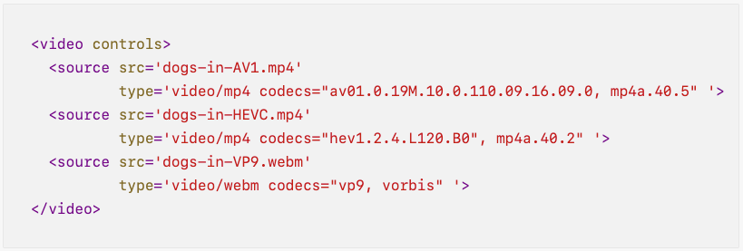 “type”属性表示正在使用的容器类型,而 “codecs “参数字符串则让浏览器知道使用了哪种编解码器以及其他特征,如配置文件、级别、色彩空间、比特深度和动态范围。这将告知浏览器,让它决定是否支持这些属性,还是需要使用旧的编解码器。也可以使用更简单的 codecs=”av01” ,但最好尽可能提供更多细节。有关开放媒体联盟(Alliance for Open Media)提供的 AV1 编解码器参数字符串的更多信息,请点击此处,有关编解码器和配置文件参数的详细信息,请参阅这份 IETF 文档。