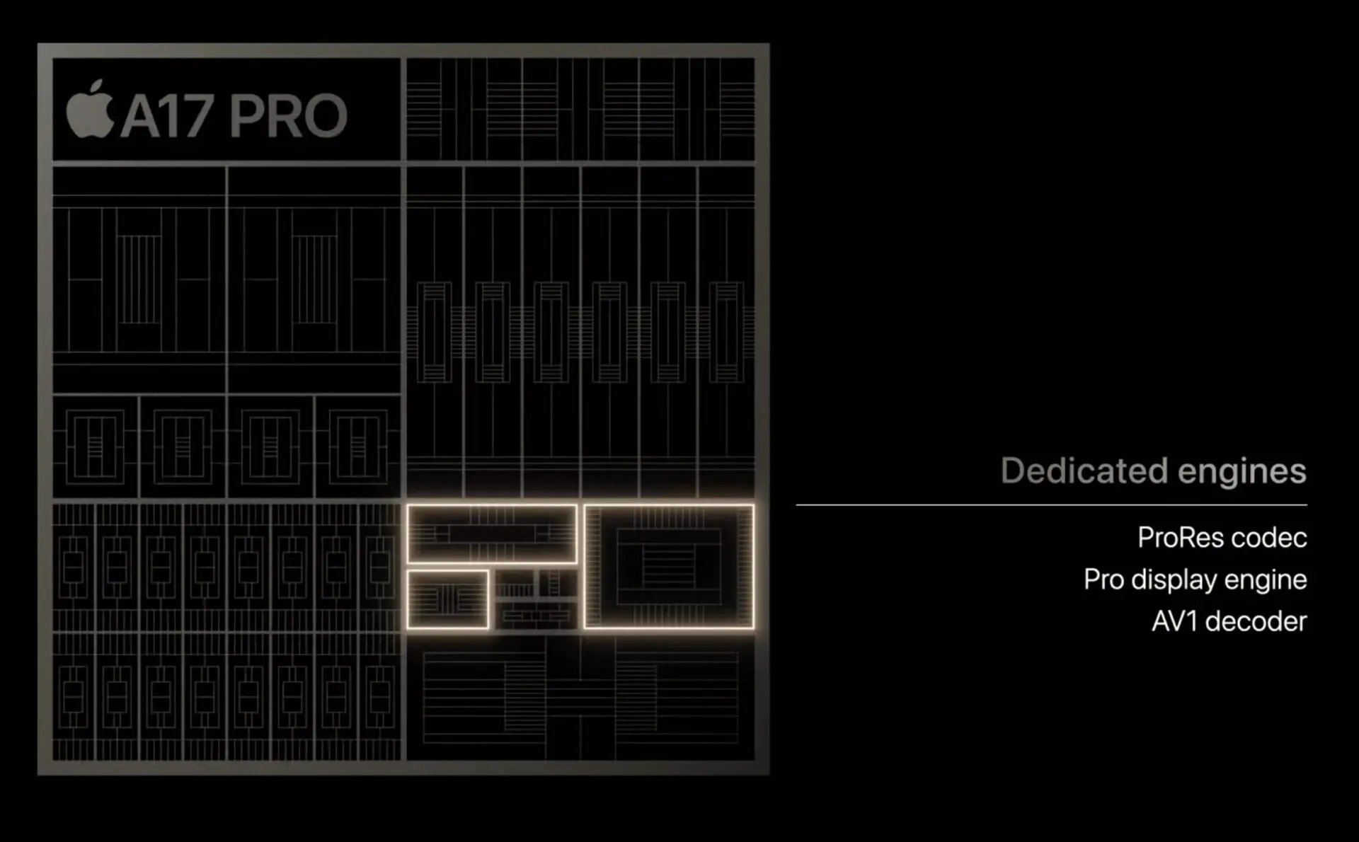 这一切在 2023 年 9 月 12 日发生了改变,苹果公司宣布其全新 A17 Pro 移动处理器将支持 AV1 硬件解码。您可以在这里观看完整的重播,其中有关 15 Pro 新处理器的部分从 1:01:20 开始。苹果硅工程集团副总裁 Sribalan Santhanam 介绍了全新的 A 系列处理器,并分享了业界首款 3 纳米芯片的细节,包括 6 核 CPU 和全新的 Pro 级 6 核 GPU。它还拥有一个 16 核神经引擎,每秒可处理多达 35 万亿次运算,并可在设备上运行机器学习模型,而无需将个人数据发送到云端。除了用于视频流媒体服务的 AV1 硬件解码器外,它还包括一个用于苹果自己的 ProRes 编解码器的专用引擎。