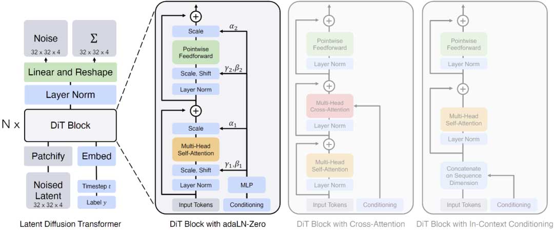 Diffusion Transformer (DiT)架构。左:我们训练调节的潜DiT模型。输入潜变量被分解成几个patch并由几个DiT块处理。右:DiT块的细节。我们对标准Transformer的变体进行了实验,这些变体通过自适应层归一化、交叉注意力和额外的输入token做调节。自适应层归一化效果最好。