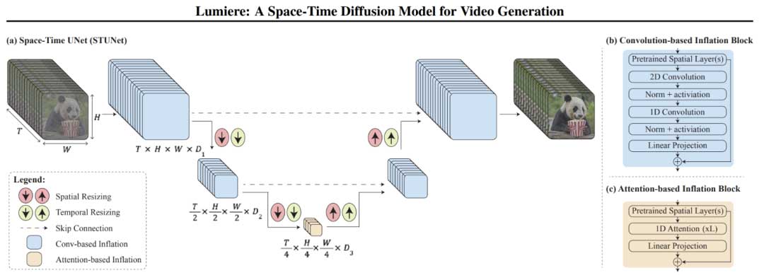 Lumiere STUNet架构。将预训练的T2I U-Net架构(Ho et al., 2022a)“膨胀”到一个时空UNet(STUNet),在空间和时间上对视频进行上下采样。(a)STUNet激活图的示例;颜色表示不同时序模块产生的特征:(b)基于卷积的块,由预训练的T2I层和因子化时空卷积组成,以及(c)在最粗的U-Net级别上基于注意力的块,其中预训练的T2I层和时间注意力。由于视频表征在最粗的级别上被压缩,我们使用有限的计算开销堆叠几个时间注意力层。