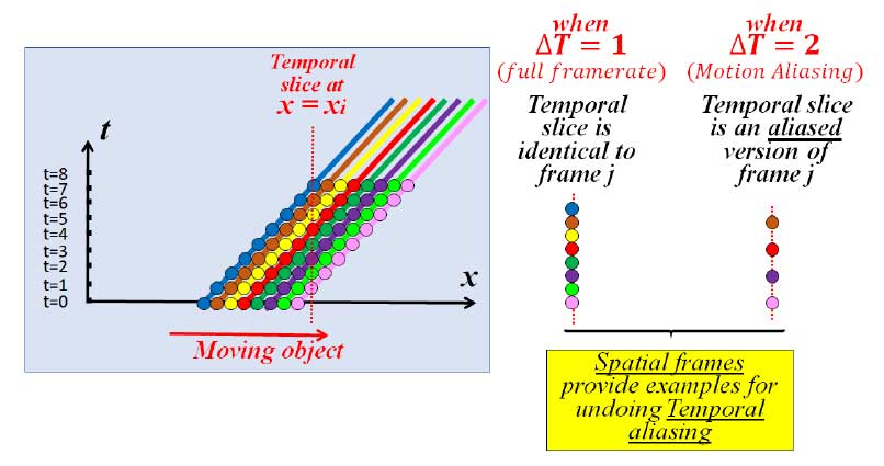 “跨维”递归的一维图示。1D对象向右移动。当适当的采样时间(T=1),时间切片类似于空间切片(1D“帧”)。然而,当时间采样率过低(T=2)时,时间切片是空间切片的欠采样(混叠 aliasing)版本。因此,空间帧提供了消除时间混叠的示例。