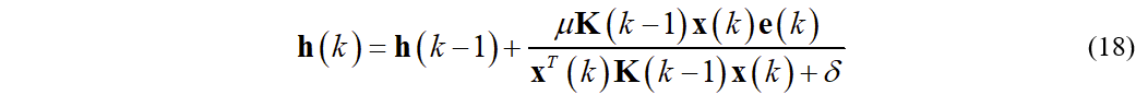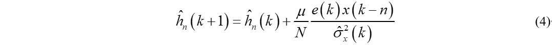 其中N是滤波器的阶数,μ是学习步长。当x是平稳随机过程时,公式(3)的估计方法是比较精确的,然而当不满足上述条件时,公式(3)估计的结果可能与真实结果相差较多。从上述公式可以看出,NLMS更新步长是固定的。