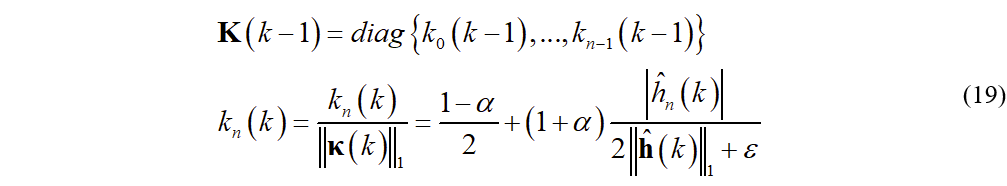 PNLMS 算法的收敛速度提升是以回声路径脉冲响应具有高稀疏程度为前提条件的,因此在一些低稀疏度的场景下,其效果甚至没有 NLMS 算法表现好,且随着迭代的进一步进行,其收敛速度会发生显著减缓的情况。为了解决这一问题improved PNLMS(IPNLMS)被顺势提出,其主要思想是对公式(11)中的“比例”进行优化,当权重系数估计不正确时公式(11)中取最大值的方法对收敛是有影响的,基于此,IPNLMS提出来一种更平滑的方式去计算比例。
