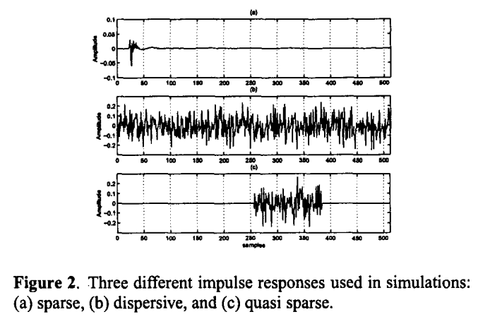 我们最后看下NLMS、PNLMS、IPNLMS的对比,我们模拟三种不同的回声路径,它们的脉冲响应如下所示: