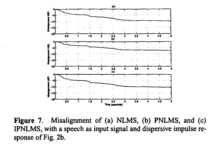 当时使用语音输入作为输入,使用(b)中的回声路径模拟,滤波器失配结果如下,可以发现PNLMS在非稀疏的回声路径下仍可以取得比较好的跟踪结果。