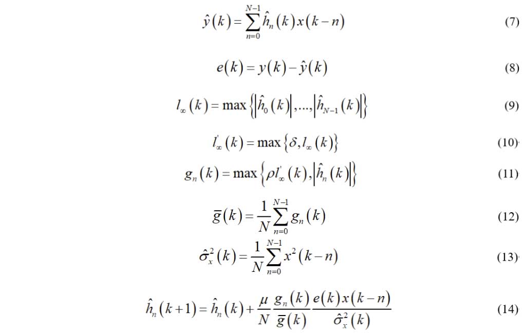 PNLMS 算法与 NLMS 算法的不同之处在于,可用的自适应“能量”在抽头上分布不均匀,其公式如下所示: