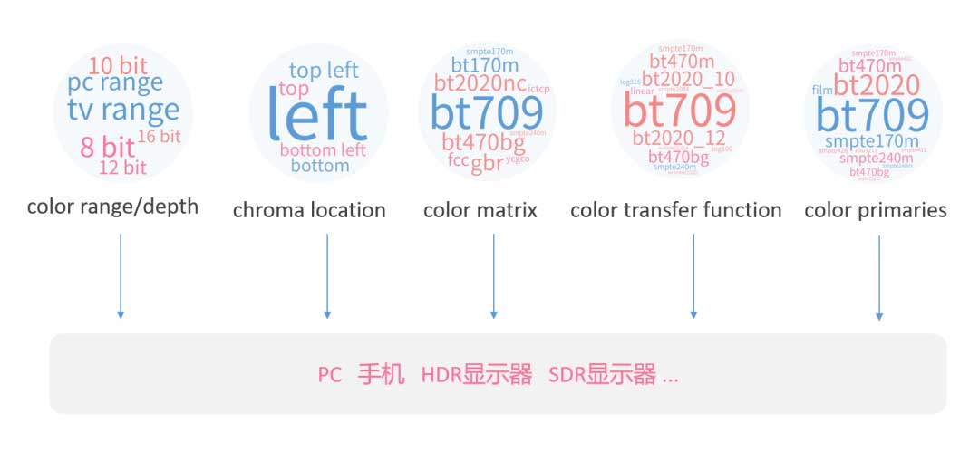 目前B站UP主投稿视频是千变万化的,它们包含各种不同的色彩参数, 比如不同的色深,不同的色度采样坐标,不同的色彩空间,不同的亮度传递函数等等(如下图),而且每个用户观看这些视频的终端也不一样,这样就产生了各种各样的兼容性问题——很多时候用户的设备并不能完全正确显示UP主投稿的“原片”,而且老旧的设备或者浏览器也并不支持广色域或者HDR视频。为了考虑终端设备的兼容性和B站服务的完整性,我们会对用户投稿的不同色彩空间的视频进行统一处理。但是如何将各种不同色彩参数的视频进行准确地统一处理,同时又能保证视频的处理速度,这对于我们来说是一个巨大的挑战。